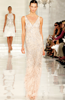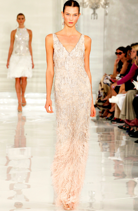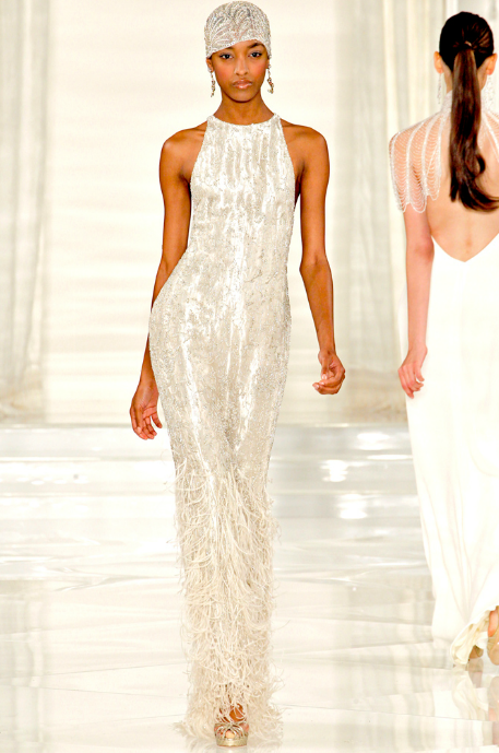 Os vestidos de melindrosa, as franjas, plumas e grafismos são alguns dos elementos que marcaram os anos 20. Abaixo, seguem alguns looks do desfile de Ralph Lauren onde a tendência está evidente.